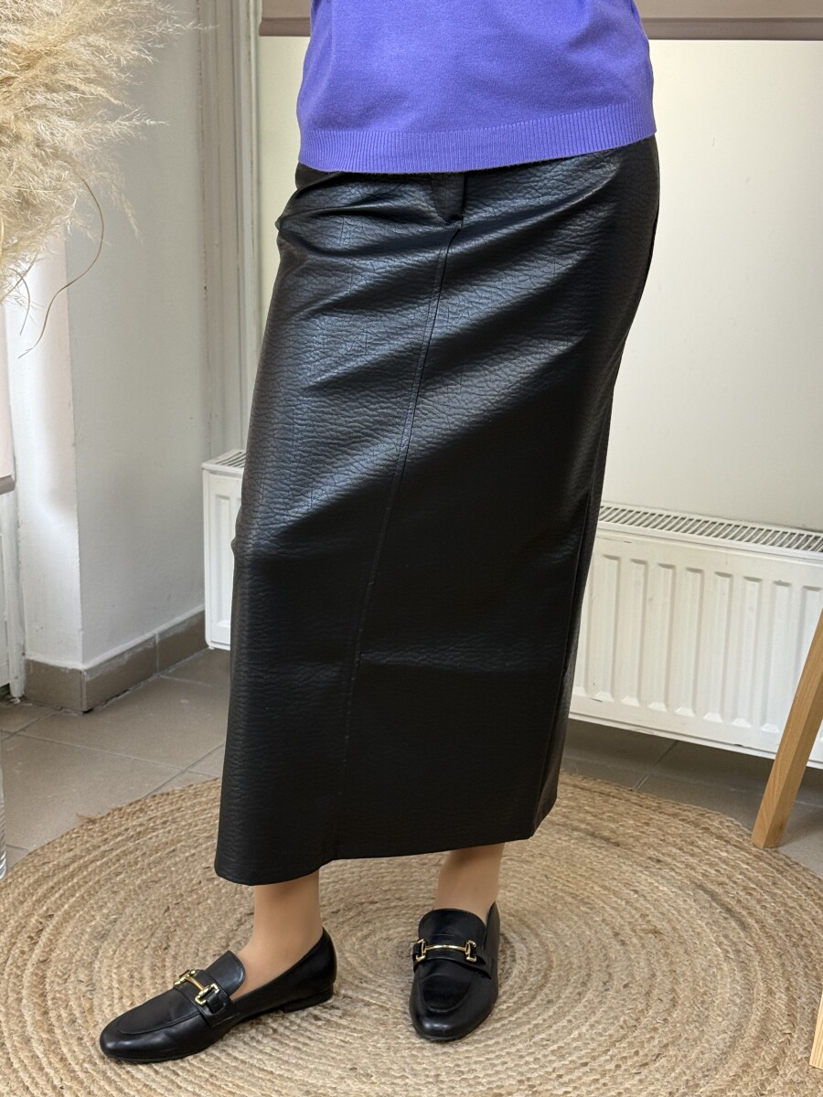 Egyenes fazonú, hátul felsliccelt, farmer zsebes, elöl cipzárral és gombbal záródó, övbujtatós midi műbőrszoknya .