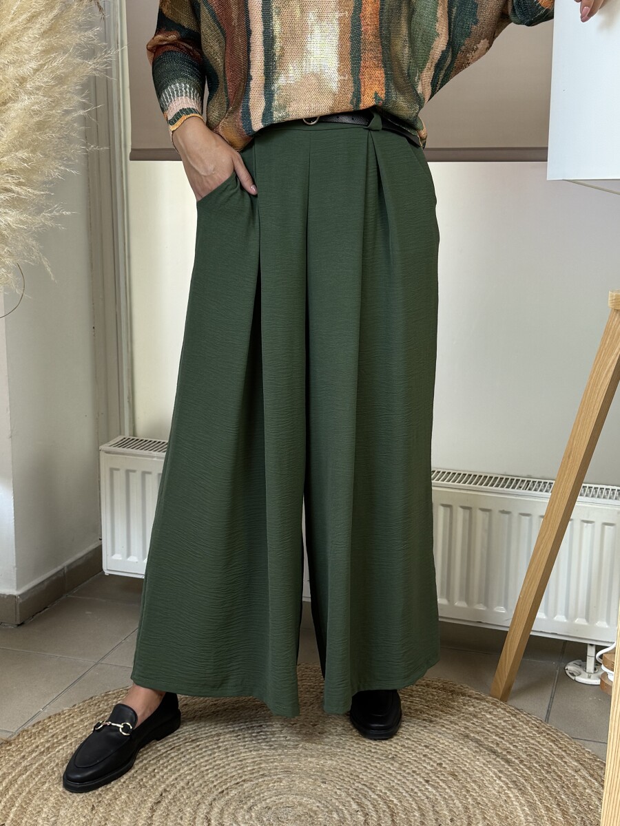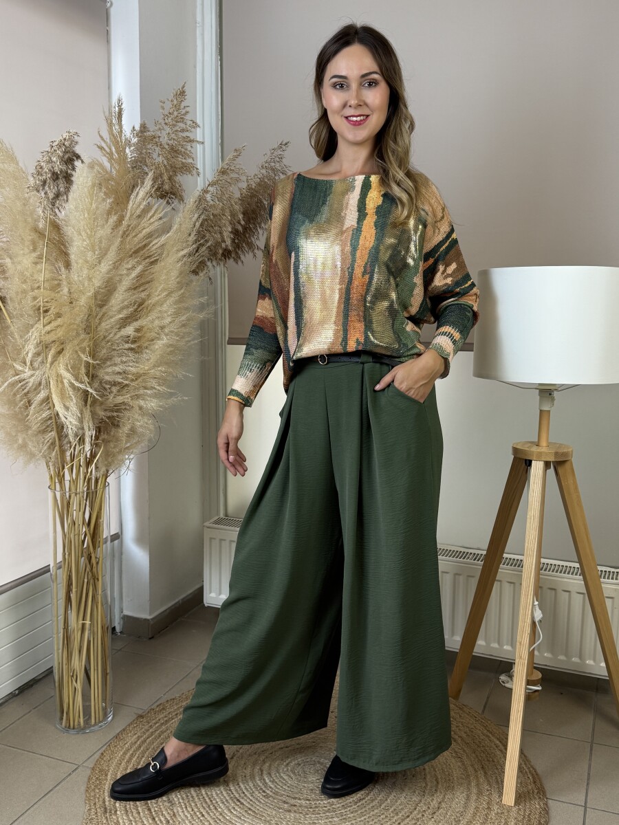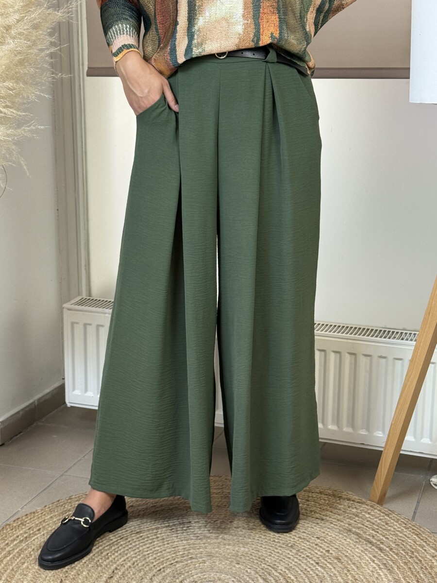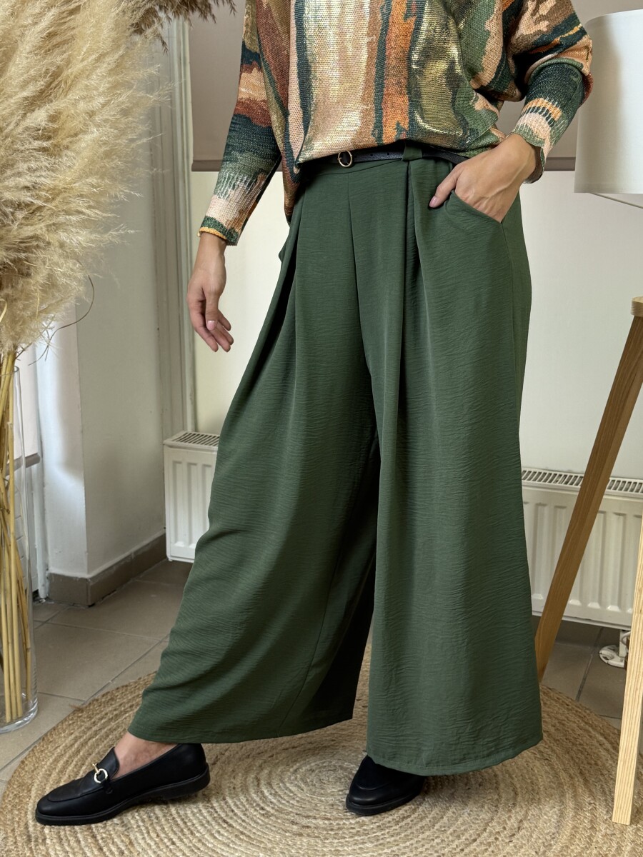 Gumis derekú, oldalán 2 rejtett zsebes, elöl csípő részen csípett, bőszárú, laza esésű, lenge anyagú nadrág .