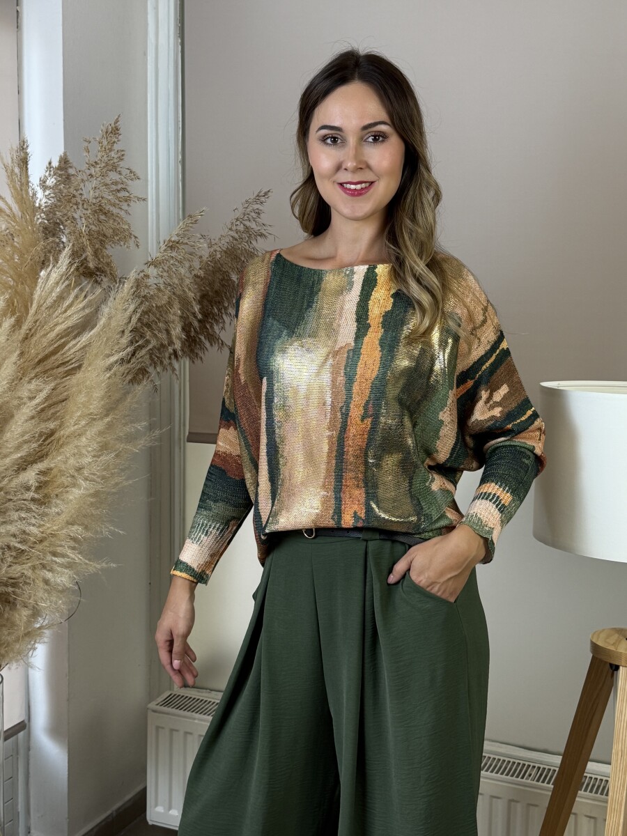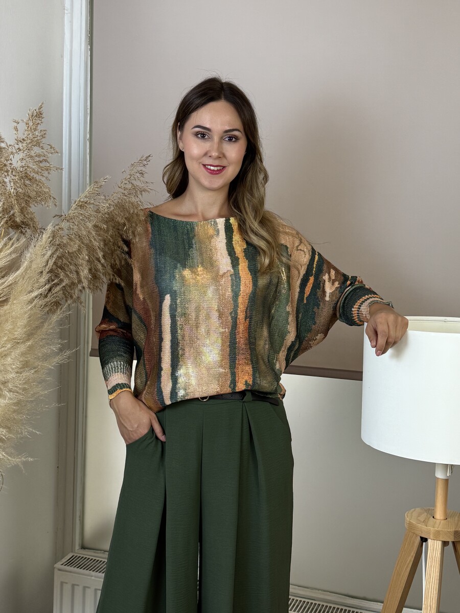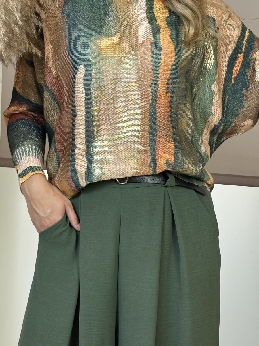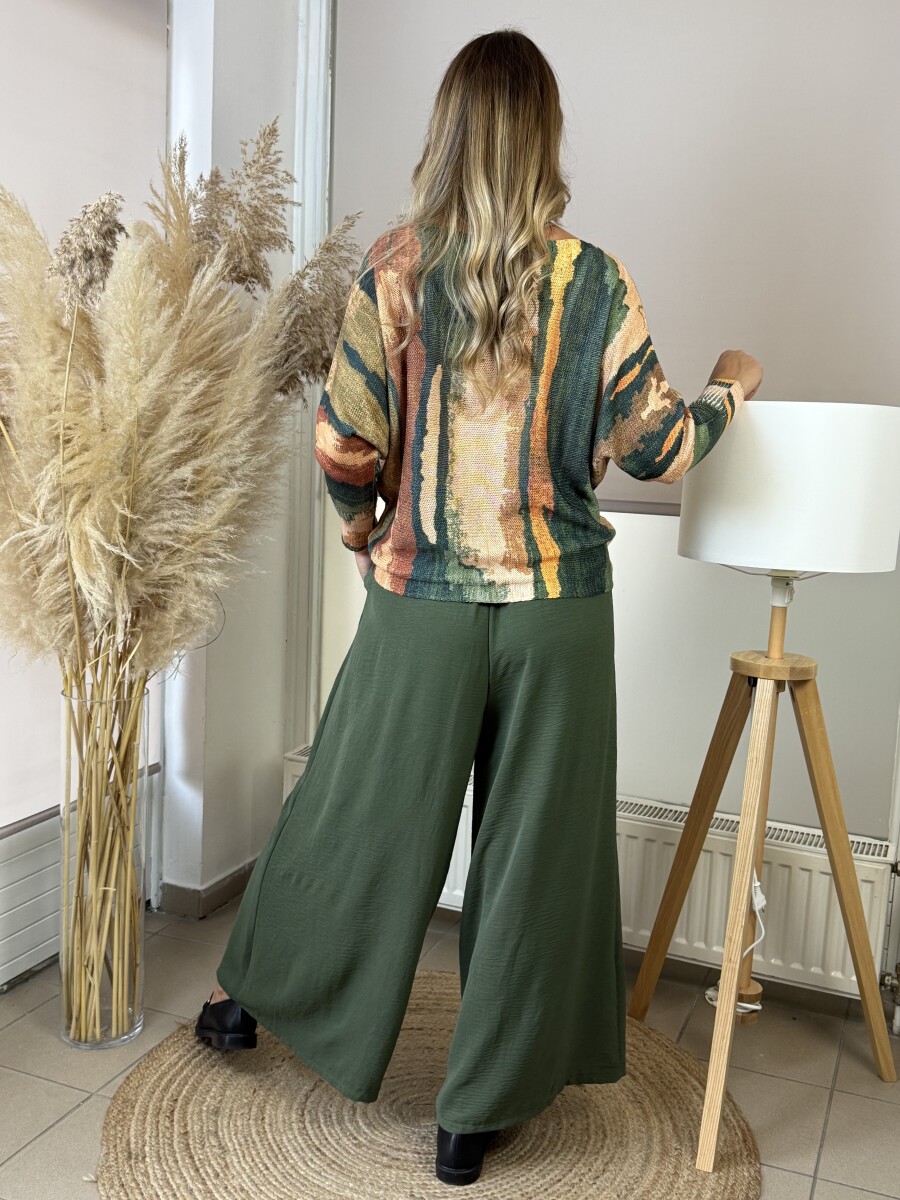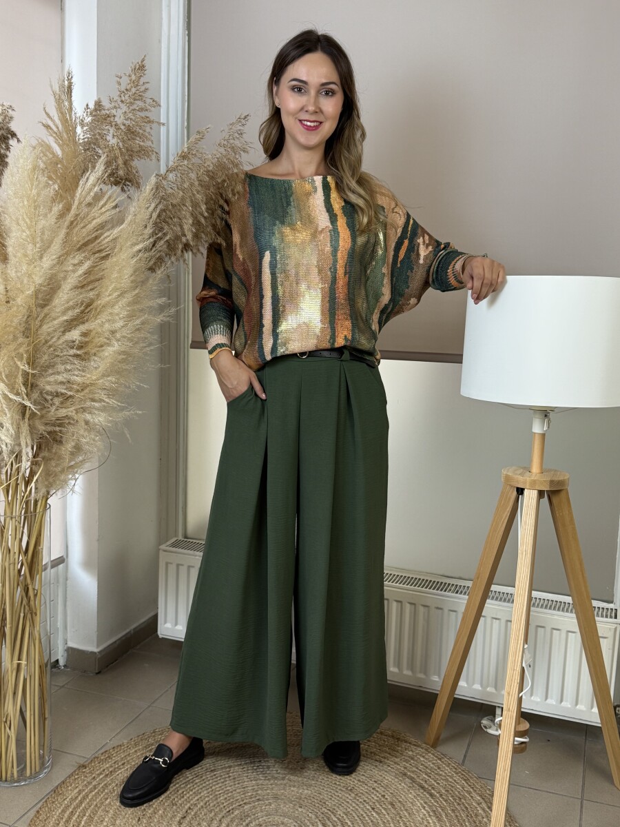 Gumis derekú, oldalán 2 rejtett zsebes, elöl csípő részen csípett, bőszárú, laza esésű, lenge anyagú nadrág .