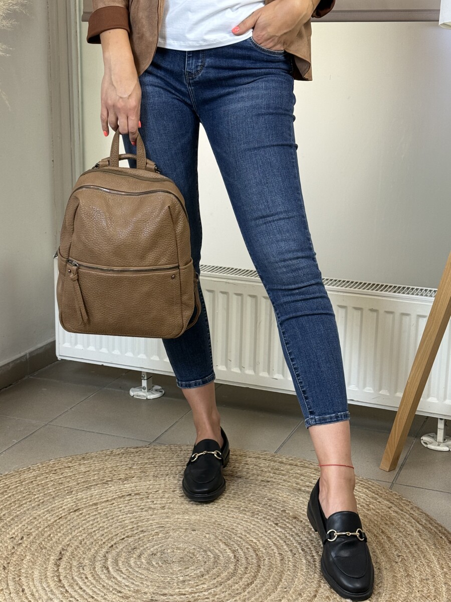 Oldalzsebes, elöl cipzáras, felső cipzáras részen pakolható, füles, vállon és háton is hordható hátitáska .
