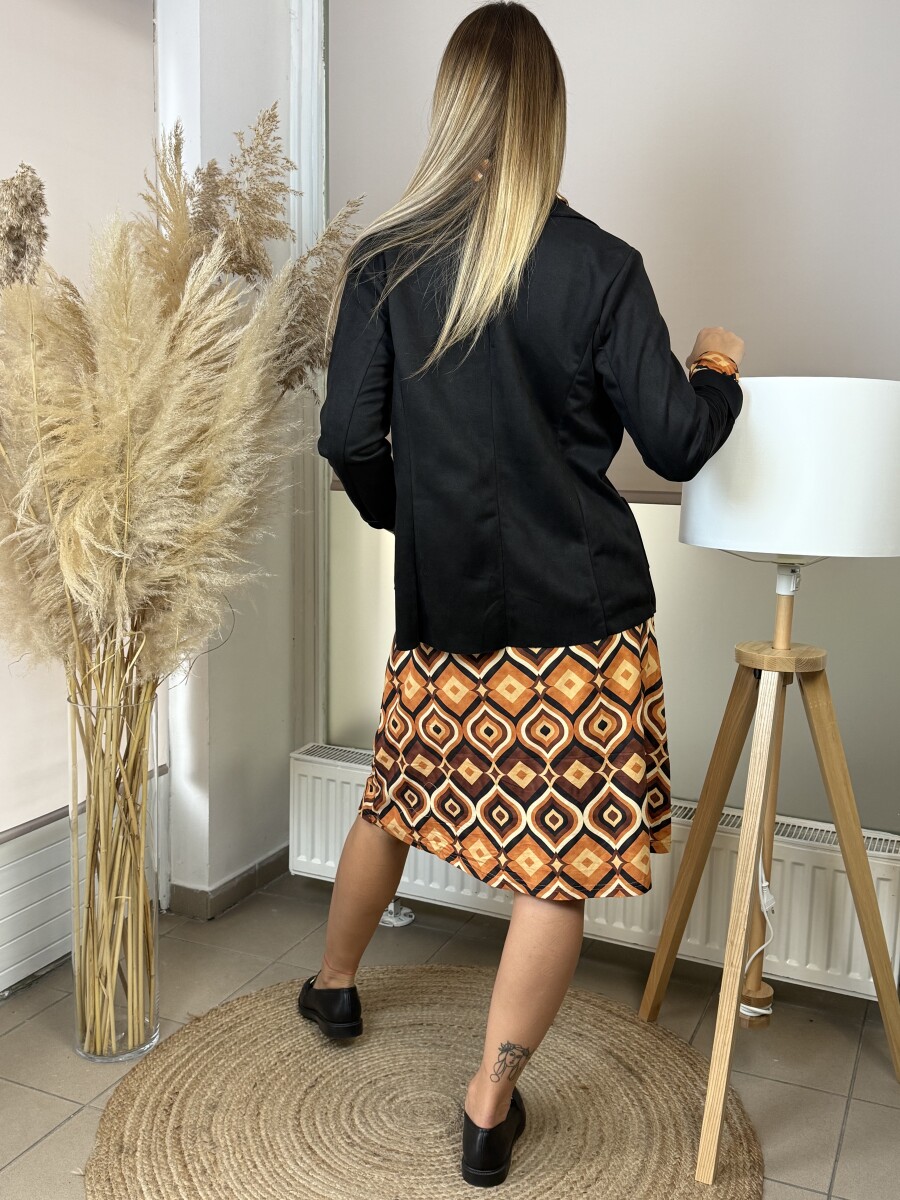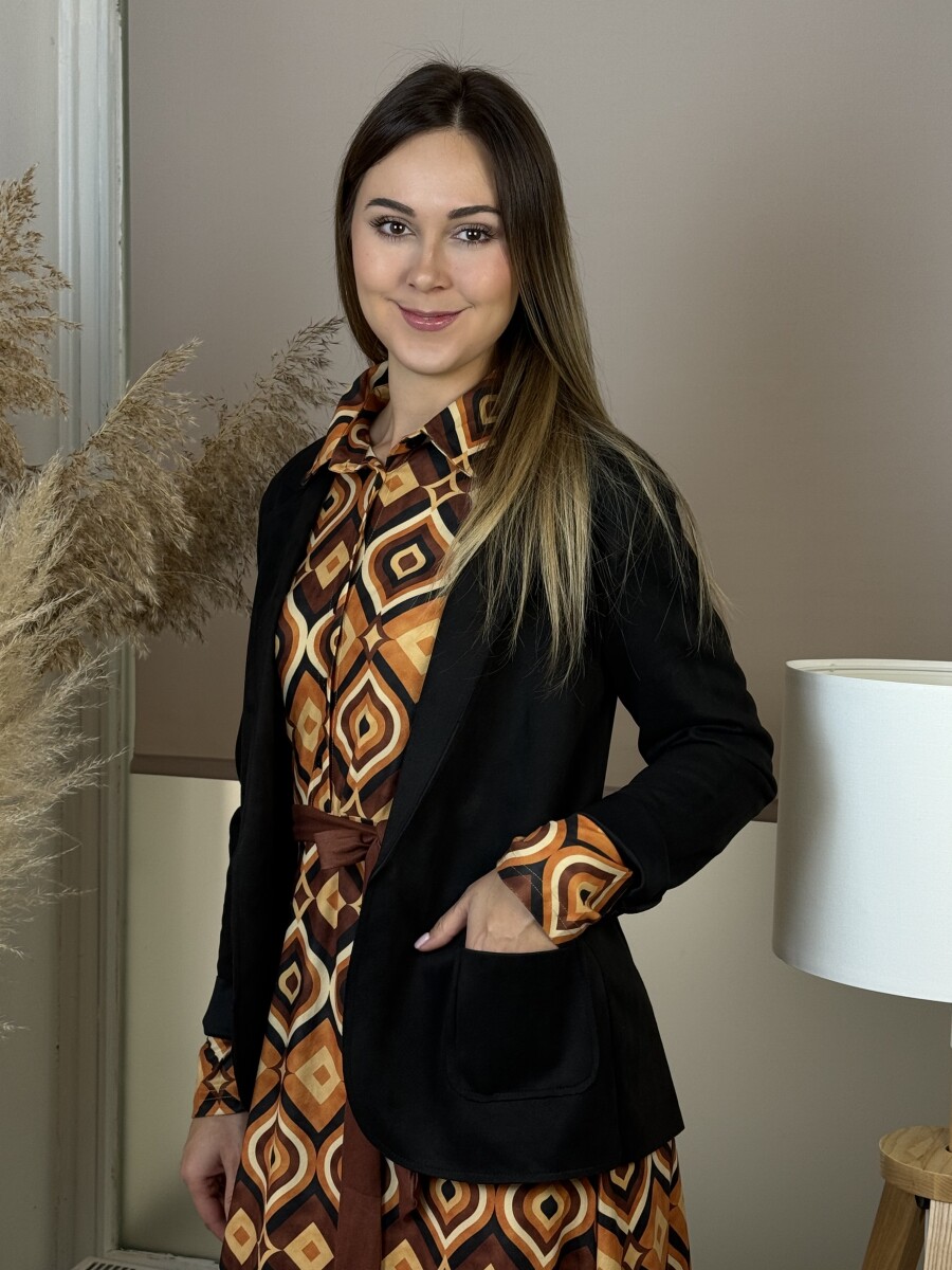 Enyhén karcsúsított, sálgalléros, elején 2 zsebes, bélés nélküli, szélein lézervágott blézer .