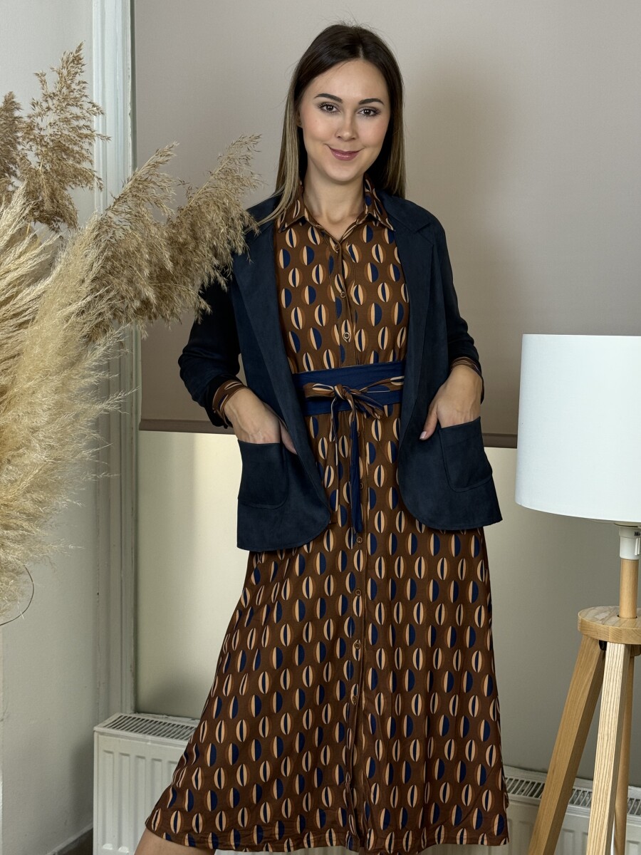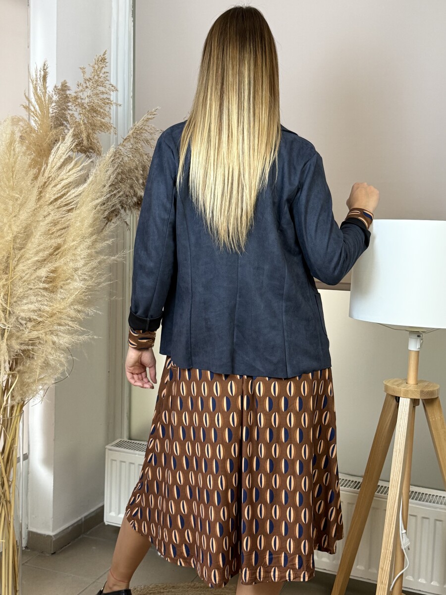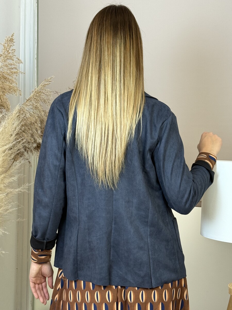 Enyhén karcsúsított, sálgalléros, elején 2 zsebes, bélés nélküli, szélein lézervágott blézer .