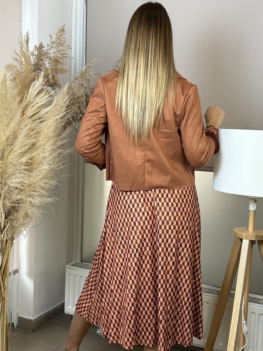 Enyhén karcsúsított, sálgalléros, elején 2 fém cipzáras dísz zsebes, bélés nélküli, szélein lézervágott rövid állású kabátka .