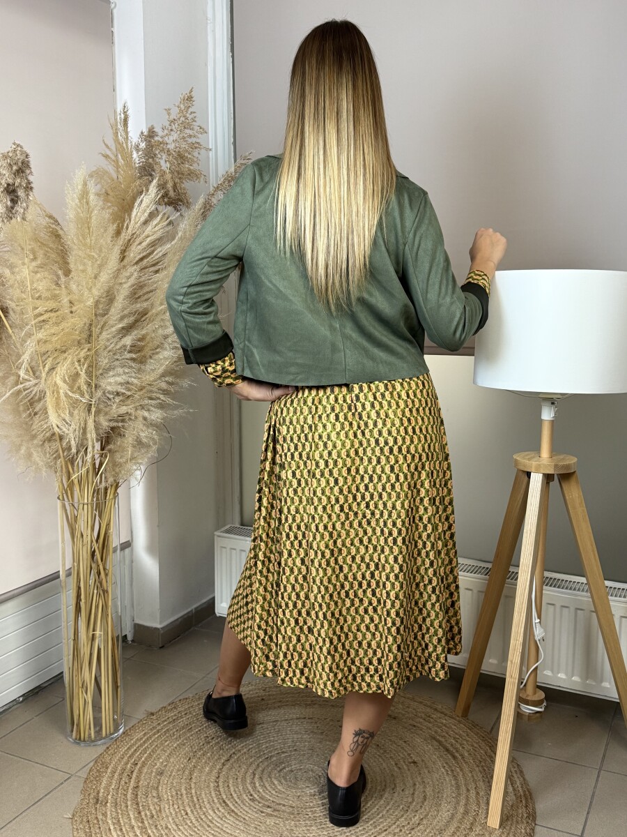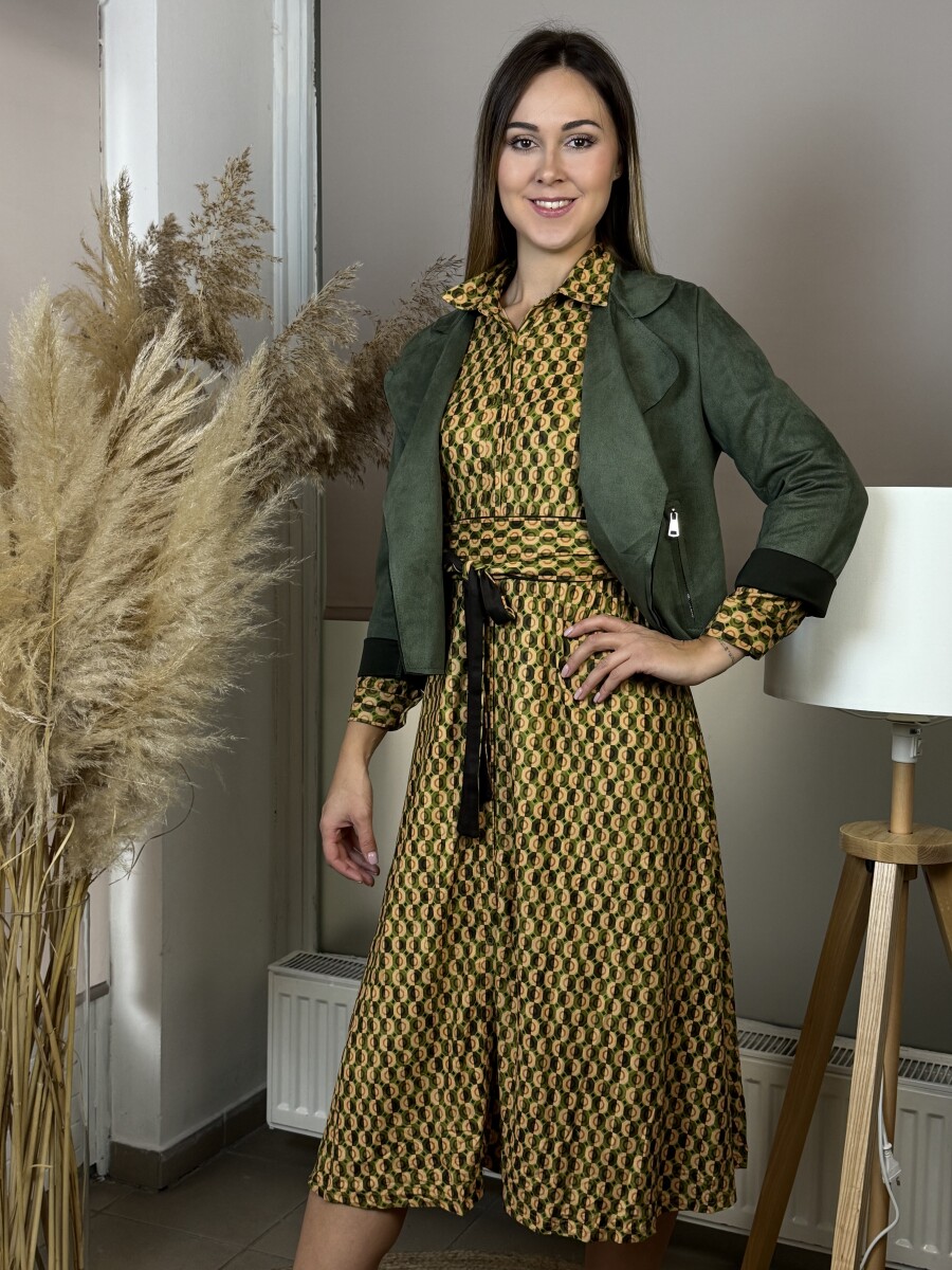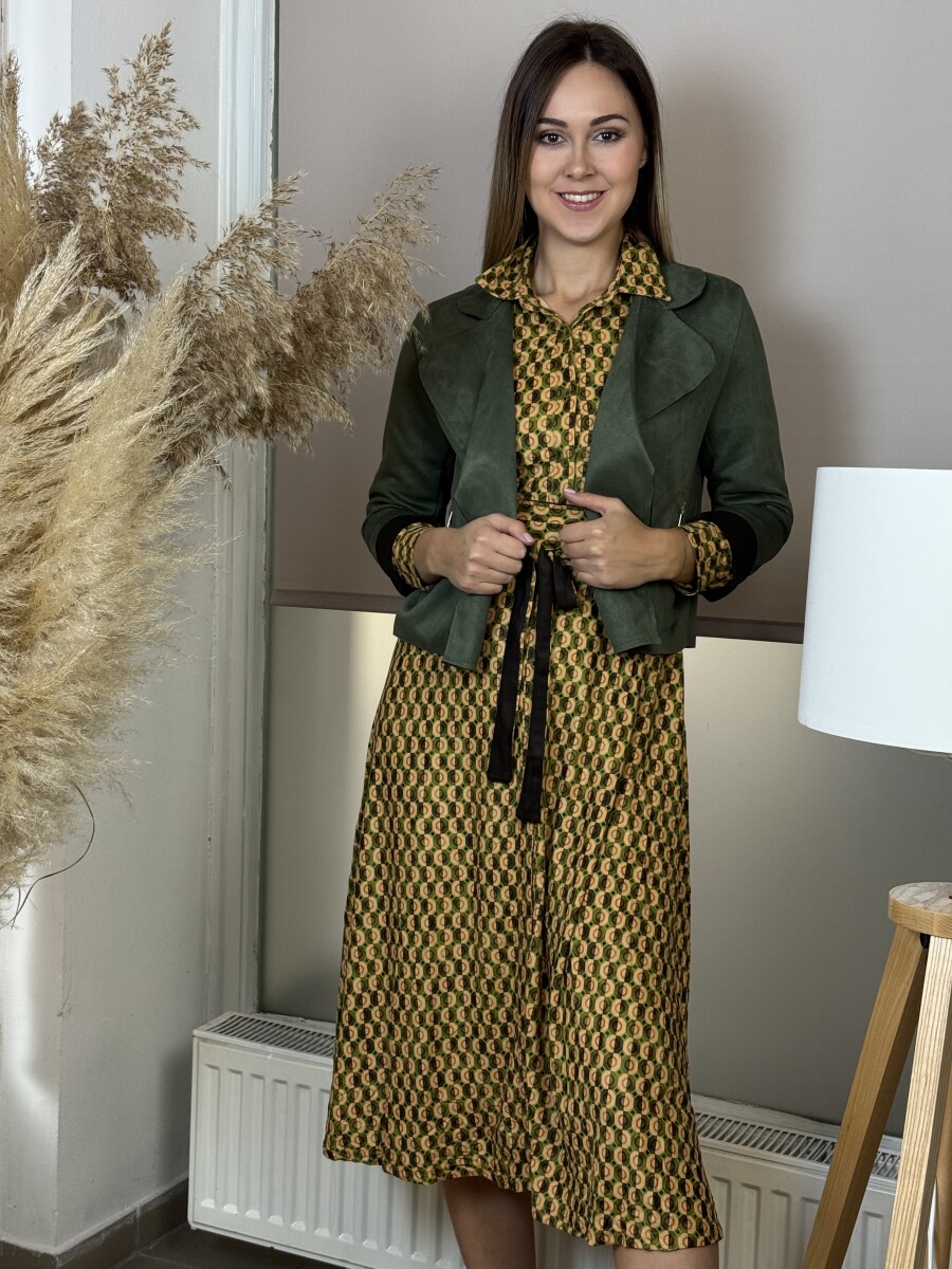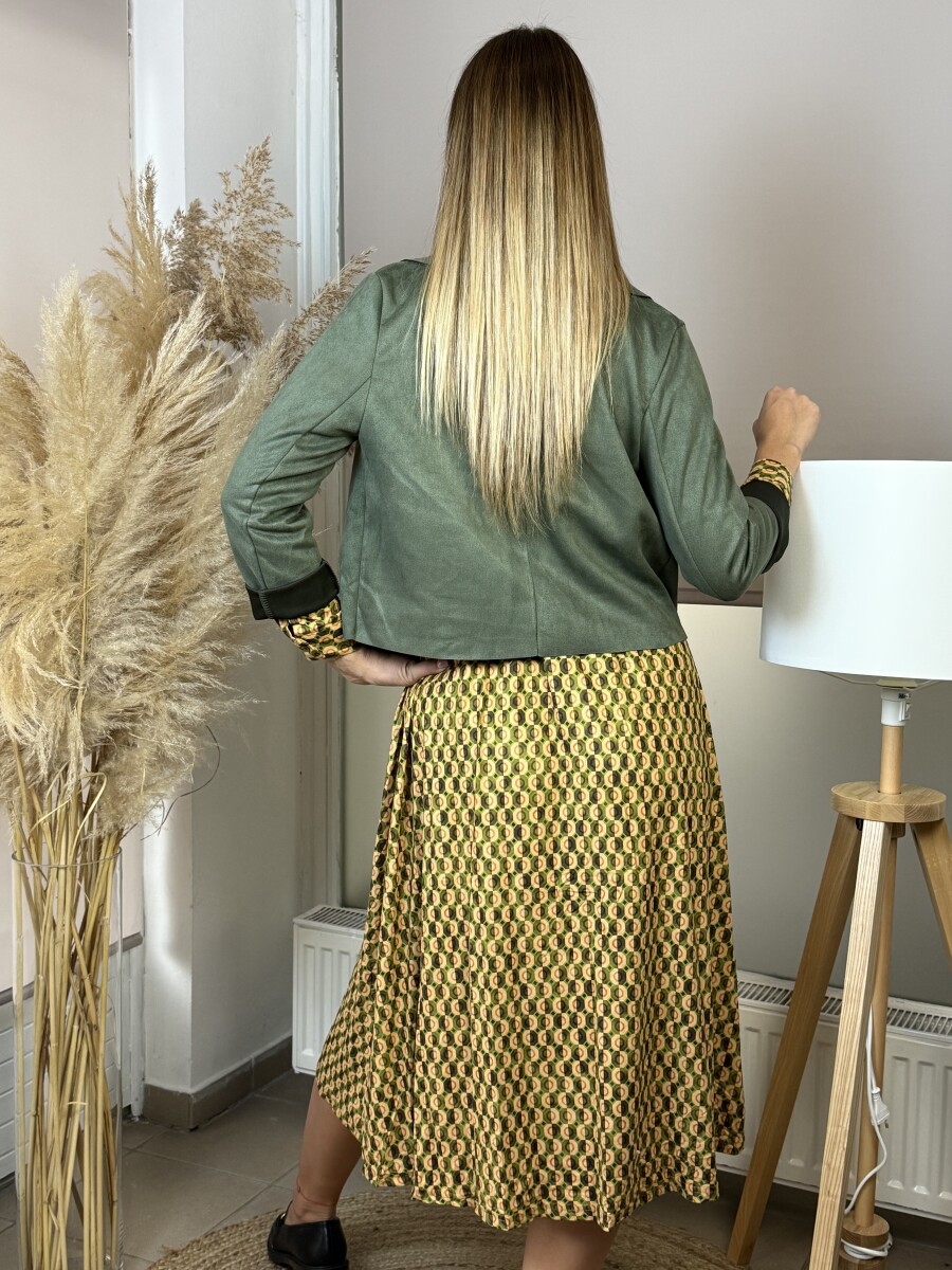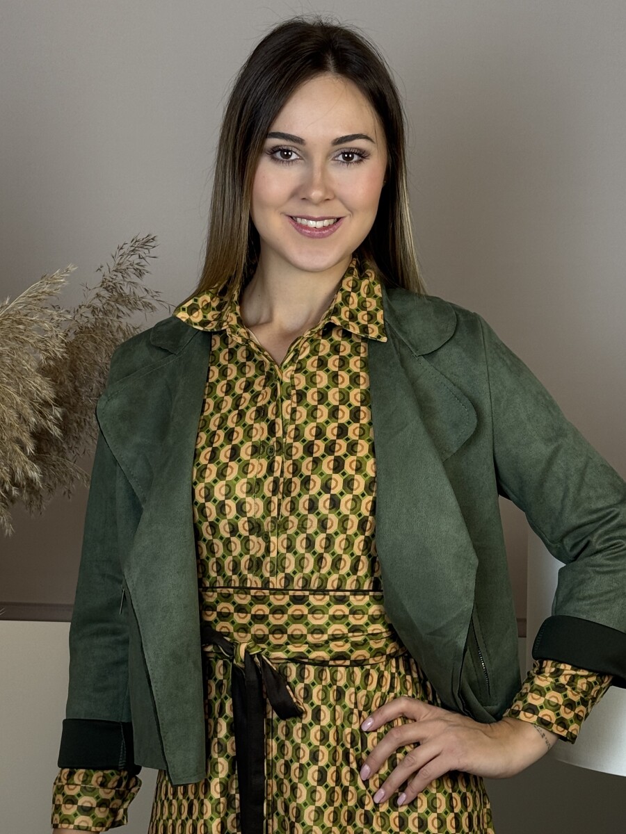 Enyhén karcsúsított, sálgalléros, elején 2 fém cipzáras dísz zsebes, bélés nélküli, szélein lézervágott rövid állású kabátka .