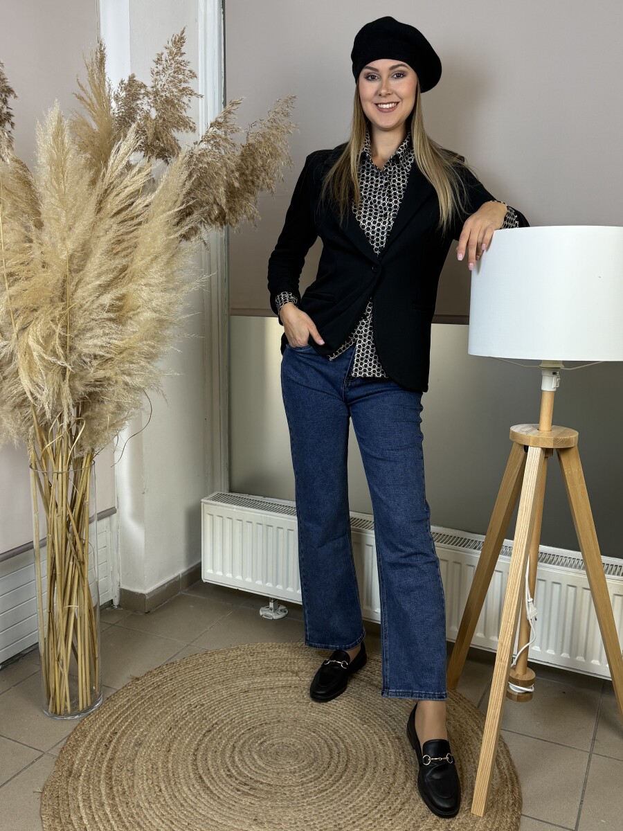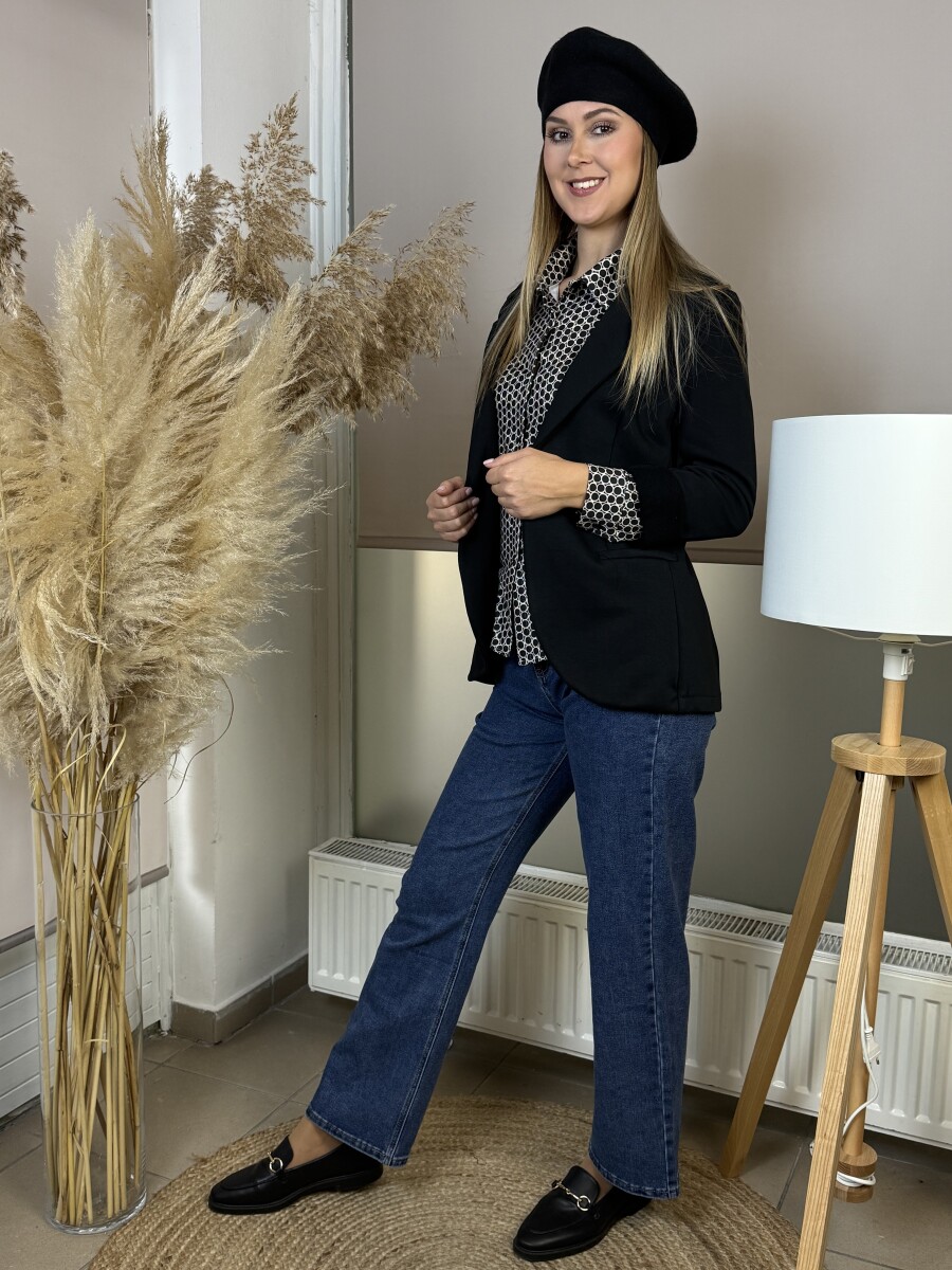 Karcsúsított, egyenes szabású, vágott sálgalléros, díszzsebes, elején egy gombbal záródó, vastagabb anyagú pamut zakó.